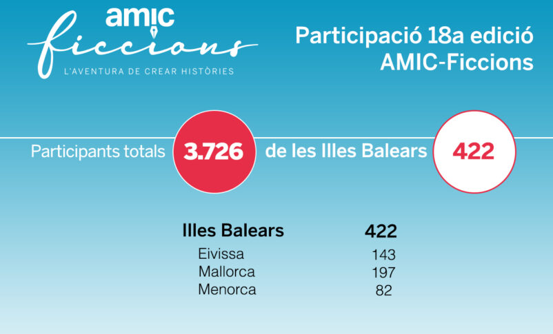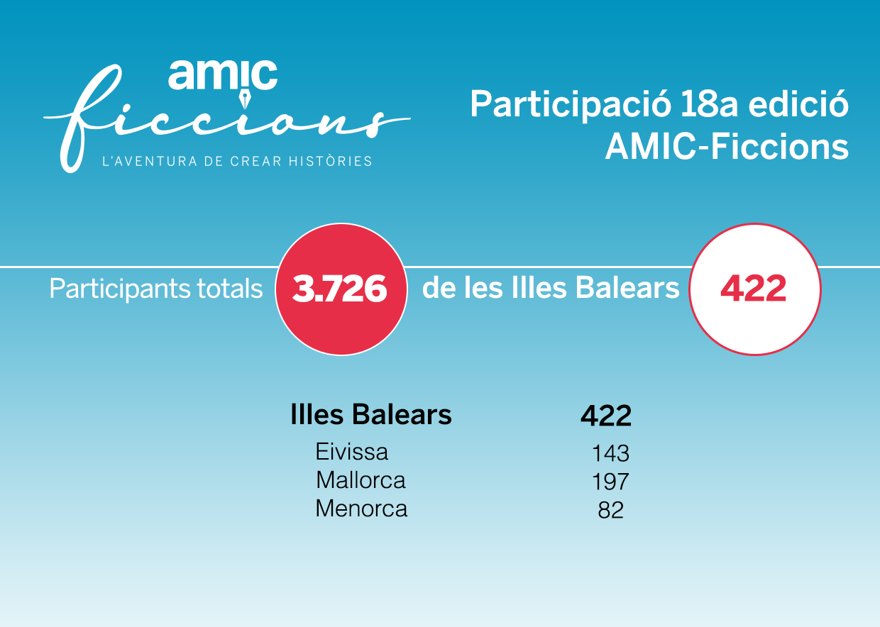 El concurs literari “AMIC-Ficcions, l’aventura de crear històries” ha tancat les seves dades de participació de la 18a edició amb un total de 3.726 joves registrats de 256 centres educatius de Catalunya, Illes Balears, País Valencià, i Aragó. Concretament, a les Illes Balears participen un total de 422 inscrits de 27 centres educatius. El Col·legi Sant Antoni Abat de Son Ferriol és el centre més participatiu de les illes amb 141 inscrits, 9 més que en l’anterior edició.